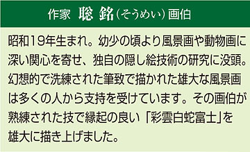 虹色の雲の中に白富士が映える贅沢な掛軸をご紹介します。御利益の大きい蛇のなかでも、ひときわ強大な開運力を秘めた「白蛇」は弁財天の化身とされ、金運や財運、幸運を招来してくるといわれています。その「白蛇」が霊峰富士に現れ、吉祥現象の彩雲(虹雲)に向け天高く昇るこの上ない吉景をしたためた大招金開運図の一幅です。縁起の良とされるい鶴が舞、亀が泳いでいます。作者は風景画や動物画を得意とする「聡銘」画伯。幻想的な「彩雲白蛇富士」を雄大に描き上げました。この縁起の良い掛軸を床の間に飾れば貴家を繁栄に招いてくれることでしょう。本格的な三段本表装に仕上げたこの一幅をこの機会を逃さずに貴家の金財運・開運上昇の一幅としてお買い求めください。
