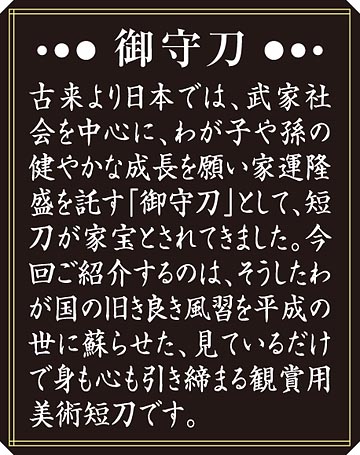 古来より刀剣には、魔除けや厄除けの霊力が宿ると信じられており、武家社会では嫁入り道具のひとつとして「嫁入り短刀」と呼ばれる御守刀が用意されてきました。婚礼の花嫁衣装である白無垢の左胸に房紐が覗いているのもその時代の風習の名残といわれています。今回ご紹介する御守刀は、漆黒の鞘にまばゆい金色で、有り難い「八十八箇所巡礼」の寺号を施しました。その一振り一振りに、日本人の心の奥深くに今も生き続ける大師様の済世利民の念願が込められています。お子様やお孫様の誕生を機に、わが家の守護として、お求めになられてはいかがでしょうか。専用の横置き台座をお付けしてのお届けで、床の間にお飾りになれば、身も心も引き締まります。刃の付いていない鑑賞用美術短刀であり、成人や婚礼のお祝い品としてもおすすめです。