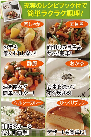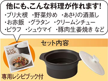 とにかく便利な電子レンジ。ただ加熱ムラが起こるので、煮物などには不向き。そんな弱点を解消して、煮物も美味しく簡単にできる電子レンジ鍋をご紹介します。加熱ムラの原因となっている、当たりすぎるマイクロ波を均一に当たるよう、鍋底から加熱するよう設計して、まるでガス火調理並に仕上がる電子レンジ鍋です。材質も耐熱セラミック製なので、臭いや色移りも気になりません。材料を切る→調味料と一緒に鍋に入れる→電子レンジで加熱する、たったこれだけ!65種類のレシピを掲載した専用レシピブックをお付けします。超簡単電子レンジ調理を実感してください。