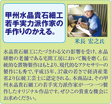 艶消しした水晶玉の可愛らしい蛙の表情の目にエメラルドを象嵌して作った心和むブレスレットです。蛙は「無事かえる」「お金が返る」「若返る」など、無病息災、金運などを意味する縁起の良い生き物とされます。水晶は透明の美しさから精神を浄化して純粋なエネルギーを引き出すといわれています。また水晶の他にも魔除けをもたらすといわれる本ひすいやクォーツァイトを連ねた美しいブレスレットです。作者は経済産業省認定の甲州水晶貴石細工の伝統工芸士である若手実力派作家の米長宏之氏が手掛けたオリジナル作品。ユーモラスで可愛らしい蛙のブレスレットは身につけているだけでも気分が弾み、お友達との話題も盛り上がることでしょう。