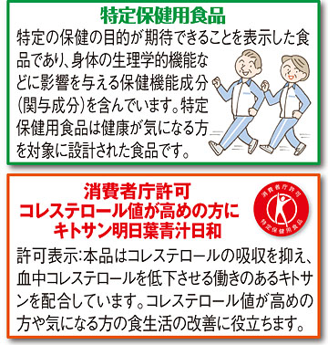 消費者庁から許可された特定保健用食品の青汁をご紹介します。美容と健康のために、毎日の青汁が体に良いことはよく知られています。今回ご紹介するのは明日葉の青汁。明日葉は豊富な栄養素を含んだ緑黄色野菜で、葉を摘み取っても明日には新しい芽を出すと言われるほど生命力にあふれた健康野菜。更にこの青汁、血中コレステロールを低下させる働きのあるキトサンを配合し、コレステロール値が気になる方のために工夫された『トクホ』の青汁です。アイスでもホットでも美味しくお召し上がりいただけます。野菜不足を補いながら、コレステロール値を低下させることができる青汁、是非毎日の習慣にして下さい。