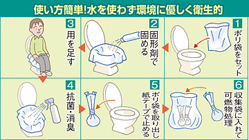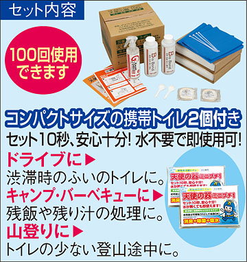 地震などの災害時に断水してトイレが使えない、どうしよう?この商品があれば大丈夫。水を使わず簡単便利に用便できる災害備蓄用トイレセットです。和洋どちらでも使え、トイレが壊れた場合でもバケツやダンボール等で使えてとっても安心。車で移動中に急にトイレに行きたくなった、アウトドアで周辺にトイレがない、そんな困った時でも便利に使えます。気になる排泄物の臭いも抗菌・消臭剤を使うため衛生的で心配なし。使い方は、ポリ袋に固形剤を入れて用を足し、収集袋におさめて可燃物処理するだけと簡単。軽量・コンパクトサイズで狭い場所でも保管できます。備えあれば憂いなし。一家に一台、防災グッズとしてぜひとも家に置いておきたい商品です。