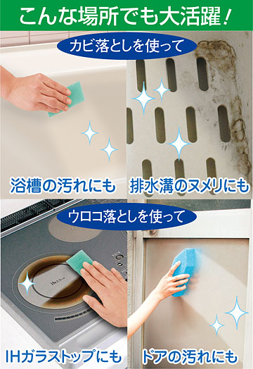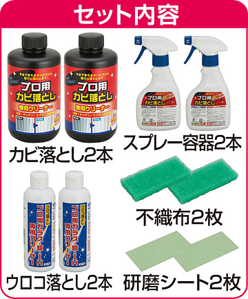 浴室をはじめ、水まわりの汚れを落としピカピカにする!掃除のプロが使っている業務用を家庭版にした「ウロコ落とし・カビ落とし」セットです。浴室の鏡を曇らせる白い汚れは「ウロコ」と呼ばれる頑固な汚れで、普通の洗剤ではまず落ちませんが、元々業務用だった「ウロコ落とし」を使えばキレイに落ちて、たちまちピカピカに。IHコンロのガラストップに付いた汚れなどもサッと落として艶を出します。浴室のタイル目地などにこびりついた、頑固なカビ汚れは「カビ落とし」におまかせ。あきらめていた汚れが簡単にキレイになります。浴室だけでなくトイレや洗面所、キッチンのシンクなどに付いたヌメリもサッと落とします。家中の水まわりがキレイになり、清潔で気持ちよい毎日が過ごせます。