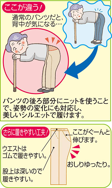 高齢の女性にとっての服装の悩みのひとつに、体型の変化で今まで着ていた服が合わなくなる…そんな不満が多いようです。そこで、このパンツがオススメ!年齢による腰の曲がりに、ズバリ対処する工夫をこらしました。ウエストの後ろ部分にニット生地を使い、前かがみ体型に沿って伸縮自在に動き、背中が見えたり肌着が出てしまったりするのを防ぎます。まさに、グッドアイデア!いつもパンツの後ろや背中を気にしながら外出していませんでしたか?これからは楽しくお出かけできます。ウエストは総ゴムで、ひとりではく・脱ぐもらくらく。のびのび生地で、立ち座りも苦になりません。早速お試しになり、颯爽と街中へ。