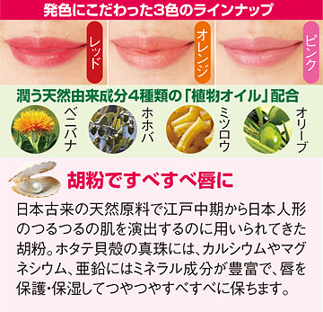 年齢とともに乾燥がすすみ、タテじわが目立ってくる唇。またご飯を食べたりお茶などを飲んだりしたあと何度も口紅を塗り直すのが面倒…。そんな悩みをお持ちの方に、胡粉や食用色素、植物オイルを配合した口紅、ふっくら潤い胡粉美人リップをおすすめします。ほたて貝殻から作られる胡粉が、ツヤツヤの唇に演出。海のミネラル成分が唇をしっかり保護して落ちにくく、塗り立ての美しさが一日中続きます。これなら塗り直しの手間や、カップやグラスに口紅がべったりつく心配もありません。またオリーブ、ミツロウ、ホホバ、ベニバナの4種類の植物オイルで保湿して、しっかり潤いを保ちます。石油由来成分は一切使用せず、天然素材に食用色素配合で作られた「唇にやさしい口紅」だから、ニオイも味も気になりません。上品な色合いの3色をセットにしましたので、装いやその日の気分に合わせて使い分けることもできます。