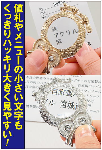 幸福を招くと言われる鳥、「ふくろう」をかたどった、たいへんおしゃれなルーペペンダントをご紹介します。普段はあなたの胸元を可愛らしく演出。お買い物やお出かけの時に商品の値札が見にくい、お食事の時にメニューの文字が小さくて見にくいなんて事がありますよね。そんな時にさっとスマートにすばやく見る事ができとっても便利。いちいちカバンからメガネやルーペを取り出す必要がありません。ルーペの倍率は3倍。値札やメニューの小さい文字もくっきりハッキリ大きく見えます。ご旅行での地図やガイドブックを見るのにも大活躍ですね。今回お色は金と銀の2色を用意致しました。お好みの色をお選びいただけます。ペンダントのチェーンの長さも70センチと使いやすいの長さになっています。是非この機会を逃さずお買い求めください。