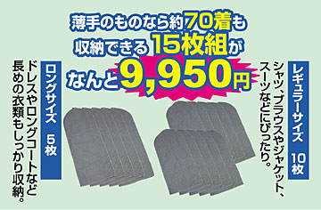 コートにスーツやブラウス、冬物に春・夏物…たくさんの衣類でゴチャゴチャのクローゼット。そこでおすすめなのが、「中身の見える衣類カバー」です。マチ付きなので衣類をまとめて保管でき、しかも透明窓付きなので中身がよく見え、外側に透明の表示カード入れも付いているので、衣類を探す時にも大変便利です。クローゼットのハンガーに面テープで取り付けるだけの簡単設置。中央の大きなファスナーで衣類をハンガーごと出し入れできるから、ラクラク。通気性に優れた不織布製なので湿気もこもらず、ホコリも寄せ付けず衣類はいつも清潔。また内側には防虫剤を入れるポケットも付いており、保管時の虫食いから衣類を守ることもできるようになっています。ジャケット・スーツ用のレギュラータイプが10枚、コート・ワンピース用の丈の長いロングタイプが5枚の計15枚ものセットがなんと9,950円!ゴチャゴチャしがちな衣類の整理はもちろん、季節に合わせて洋服をまとめて分類でき、衣替えの時にも大変便利です。ぜひこの機会にお求めのうえ、クローゼットを便利に有効にご活用ください。