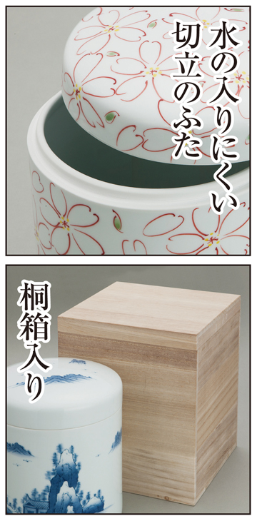 葬儀社が用意する骨壺のほとんどが中国製で味気ないものです。仏具は先祖を祀るのに大切な道具であり、骨壺は故人にとって二度と着替えることのできない最後の衣装であり、最後の家です。大切なご先祖様や親愛なる故人をもっときれいな骨壺に入れ替えてあげたい。亡くなったら夫婦お揃いの美しい骨壺にしたい、そんな方のために生まれた商品が、国産の「有田焼永遠の壺(骨壺)」。長い伝統と秀逸な技術をもつ有田焼の美術品は日本の誇りであり、世界各国に輸出されています。その格調高い有田焼の伝統技術を駆使して作った、美しい手描き絵柄入りの価値ある骨壺です。日本の伝統と文化、心を映し出す「桜絵(赤)」と「手描き山水絵」の2種類をご用意しました。水の入りにくい切立のふたを使用し、機能的にも優れています。また、大切に保管できるよう、高級感のある桐箱入りでお届けします。日本人なら日本製の上質な骨壺に入って成仏したい。ぜひ、この機会にお求めください。