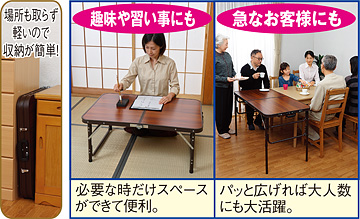 普段は場所を取らずにしまっておけ、急にお客様が来た時や趣味の時間だけ、サッと取り出して使える便利な折りたたみテーブルです。軽くて丈夫で扱いやすく、ご年配や女性の方でも簡単に広げられます。天板までの高さは37cmと74cmの2段階で、座卓にもなり、テーブルとしても使えます。天板は落ち着いた木目調で、和室と洋室のどちらにもよく似合います。使わない時は二つ折りにしてしまえ、厚さはわずか7cm。家具の隙き間に収納でき、場所を取りません。取っ手付きですので、アタッシュケースのように持ち運びでき、キャンプでのバーベキュー台などアウトドアでも大活躍。幅90cmと120cmの2タイプがあり、お部屋の大きさなどに合わせてお選びいただけます。