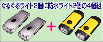 緊急時にすぐ使える便利なぐるぐるライト。手回しぐるぐるライト2個に、さらに防水ぐるぐるライト2個をお付けして4個で9,800円の価格で提供します。ライトはどちらもハンドルを一分間(約150回転)回すだけで約30分も点灯する優れもの。しかも充電式なので乾電池切れの心配もありません。ライトは3灯式の発光ダイオード(LED)。明るく長持ちなのでとても経済的です。今回お付けする防水ぐるぐるライトは、雨の中でも安心して使え、防水機能付きなので水回りや風呂場にも最適です。4個あれば居間やキッチン、玄関や風呂場、車の中などいろいろな場所に備えて、万一の時にもすぐ取り出せるので重宝です。