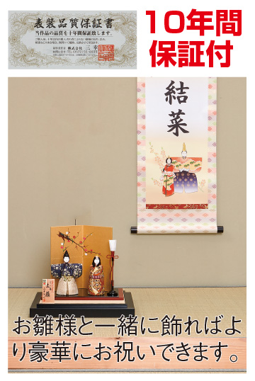 目の中に入れても痛くないほどかわいいお孫様。名付け親になられたおじいちゃん、おばあちゃんも大勢いらっしゃるのではないでしょうか。そこで、かわいいお子様やお孫様の名を入れる、ご注文掛軸のご案内です。雛人形の起源に関わる、神雛とも呼ばれる雅な立雛の絵柄で、表装は上品で華やかな西陣織金襴です。もちろん純国産品で、10年間保証の確かな品質。床の間にお飾りになれば名幅の雰囲気漂う逸品で、1万円ちょうどというお求めやすいお値段も見逃せません。桃の節句にはもちろん、お誕生日のお祝いにも自信を持っておすすめします。眺めているだけでふくよかな気持ちになり、心和む名入れ掛軸。家族の絆もより一層、深まることでしょう。