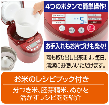 おいしいご飯が食べたい!という方々の欲求から高価な炊飯器や銘柄米にこだわる人が増えています。いいお米を買って来ても、お米も野菜と同じで段々と鮮度が落ちて香りも旨味も損なわれます。美味しいお米の条件は鮮度です。自分の家で精米出来たらいいな、ご自宅の古いお米を美味しく食べたい、そんな方に、コンパクトな精米機のご紹介です。これがあれば、毎日必要な分だけ精米してご飯をたけば、いつでも美味しいお米が食べられます。精米具合も選べ、胚芽モードがあり栄養素を残して精米できます。健康面でも大変いいですよね。ご自分にあったお米が食べられ、お手入れも簡単で、毎日精米しても苦になりません。お米のレシピブックもお付けしました。是非この機会にお買い求めください。