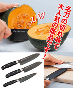 名刀の代名詞として有名な正宗。その名を伝える岐阜県関市の熟練職人の技が生んだ濃州正宗作のチタンコーティング包丁セットです。サビに強く、耐摩耗性のあるチタンをコーティングすることにより、鋭い切れ味が長続きし、面倒な刃研ぎも少なくなります。いやな金属臭もなく、汚れや臭いもつきにくく、魚や肉などの臭いも残りにくいのでとても衛生的で、お手入れも簡単です。固いカボチャや柔らかいトマトもきれいにスパッと切れる三徳包丁。小魚やちょっとした料理も手軽にできる小三徳包丁。野菜や果物に重宝なペティナイフの3本セットで、どんな調理も思いのままです。切れ味が鈍くなったら、ダイヤモンドシャープナーでサッと軽くこするだけ。女性の方でも簡単に研げて、長くご使用いただけます。
