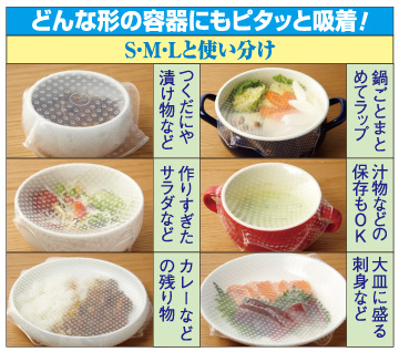 お皿やお鍋などピッタリ吸着する丈夫でやわらかなシリコンラップです。直系30cmまでの容器に使えて、丸形、角形など様々な形状の器にも対応。小サイズ4枚、中サイズ4枚、大サイズ4枚の12枚セットなのでいろいろな用途に使えてとても便利です。型くずれしにくく、食洗器でも洗え、洗剤・水洗いして何回も使える耐久性に優れたシリコン素材を使用。薄くて使いづらい、使い捨てラップの手間も省きます。電子レンジや冷凍、冷蔵庫に使える優れた素材でグーンと2倍に引き伸ばしてシリコン製ですべりにくいから、ジャムのフタを開けたり、調理加工時のすべり止めなどにも大活躍します。