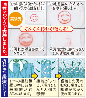 しつこい油汚れを拭き取るのは一苦労。しかも使ったふきんがドロドロに汚れてしまい始末に困るものです。今回ご紹介する「マジカルふきん・森林(もりん)ちゃん」は、画期的商品です。なんと、水に濡らして一拭きするだけで、油汚れをごっそり取り除いてしまうから不思議!秘密は天然繊維を特殊加工した超極細繊維にあります。洗剤も必要ない上に、使った後は、水ですすぐと元通りきれいになるから何度も繰り返し使えます。きれいに落として、きれいに使えるマジカルふきんで、ラクラクお掃除を!