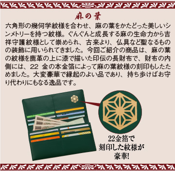 しなやかな風合いを持つ鹿革の上から、古来より吉祥守護紋様として崇められてきた、麻の葉紋様を漆で描いた、神々しくさえある銘品。日本を代表する伝統工芸のひとつ、印伝による長財布です。鹿革には、創業以来130余年の歴史と伝統を誇る、全国的に有名な老舗「藤岡勇吉本店」自慢の品を使用。手にしっくりとなじみ、使い込むほどに風合いが増します。牛革を使用した内側も見逃せません。22金の本金箔で麻の葉紋様を刻印。持ち歩けばお守り代わりにもなる、大変縁起のよい長財布です。機能性にもすぐれ、百万円がすっぽり収まる札入れに、小銭入れに便利なファスナーポケット、領収書などが収納できるオープンポケット、さらにカード類も10枚まで収納。緑の地色に黒、赤、うす茶の各色で紋様を描いた3色から、お好きな色をお選びいただけます。