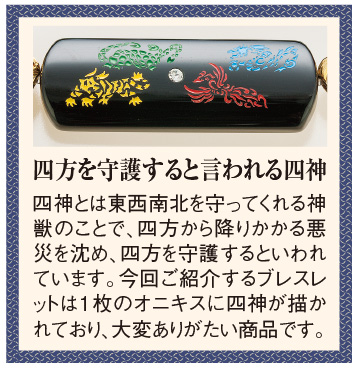 ひときわ目を惹く漆黒のオニキスのプレートに、四方を守護する四神獣を色鮮やかに描きました!東は青龍。天から恵みの雨を降らせ、豊作をもたらし家運を隆盛させるといわれています。南は朱雀。大きな翼で災厄を祓い、福を呼び寄せると伝えられています。西は白虎。子宝と安産を授け、夫婦円満に導く力があるとか。北は玄武。長寿と富貴を招く亀と、災厄を寄せつけない蛇の霊力を併せ持つといわれる神獣です。プレートと主珠に使用したオニキスは、魔除けの石として知られています。さらに金運、成功運、仕事運、勝負運を招くといわれる色とりどりの虎目石を組み合わせた、美しい逸品。手首を飾りながら開運招福をご祈願いただけます。オニキスを中心にシックにまとめたAと、浄化の石として知られる水晶も加えたBから、お好きなタイプが選べます。
