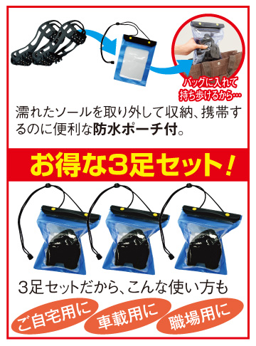 急に雪が降った日も慌てることなく、サッと靴に装着するだけでスノーシューズに変身させる便利な氷雪専用スパイクです。つま先とかかとに配した片足24個のスチール製のツメががっちり氷雪をキャッチ。ツルツルの路面でも滑って転ぶ心配がなくなり、いつもの路面のように歩けます。伸縮性のあるラバー素材なので装着もラク。三足セットなので、自宅用、職場用、さらにクルマ用と使い分けられ、いざという時もすぐに使えて安心です。防水ポーチ付きですから、バッグを濡らすことなく持ち運びもできます。普段のお出かけはもちろん、除雪作業、寒冷地への旅行など幅広く大活躍。冬本番に向けて、ぜひお備えください。