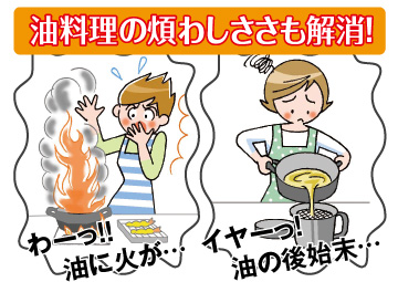 サクッとおいしい揚げ物、たまに食べたくなっても火傷や火事の心配、油処理や掃除の面倒さを思うとやめてしまう…。そんな方におすすめの「揚げ物もできる電子レンジ調理器」です。プレート底面の発熱シリコンがマイクロ波を吸収して発熱し、3分の加熱で約200℃になるので、電子レンジでも揚げ物が簡単に作れます。蓋がマイクロ波をカットするため、仕上がりもパサつかずふっくら。片付けもフライパン感覚で洗うだけで完了し、台所やレンジ内の油の飛びはね汚れもありません。「揚げる」の他、「焼く」「炒める」「煮る」「蒸す」をこなす1台5役で、いろいろな料理に活躍します。