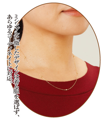 お洒落心と遊び心を忘れない大人のための上質なネックレスです。小豆チェーンには、永遠の価値と煌きを約束してくれる18金を使用。気品に満ちたゴールドの輝きは、着けるたびに贅沢な気分が味わえます。さらに、チェーンにはスライド可能な7つのミラーボールを使用。ボールをお好きな位置に変えれば一本で何倍ものデザインが楽しめます。全長43cmとゆったりとしているので、忙しいお出かけ前もサッと素早く着けられて大変便利。留め具は通常のものよりも大きめなので、付け外しも簡単です。また、シンプルに徹したデザインは着る服を選ばず、あらゆるコーディネイトに対応。秋のお洒落はもちろん、一年を通じて活躍してくれるので重宝します。