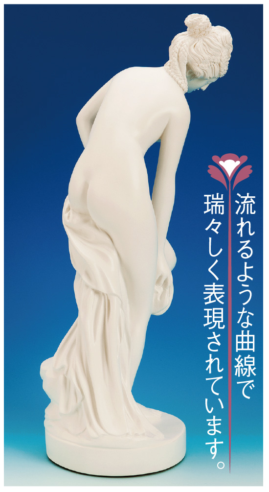 あなたも歴史あるヨーロッパの芸術のエッセンスを日常に取り入れて豊かな時間を過ごしませんか。これは18世紀に活躍したフランスを代表する高名な彫刻家アルグランの「湯浴みするヴィーナス」を見事に再現した作品です。肩からに足先にかけてしなやかに流れる曲線、透き通るような瑞々しい白い肌、艶美でふくよかな肉体美…。置くだけで高貴な芸術の香りを感じさせます。高さ50cmとリビングや玄関にちょうど飾りやすいサイズで、確かな存在感とまぶしいほどの白さで空間を高貴に明るく演出。きっと訪れる方もこの美しさに魅了されることでしょう。