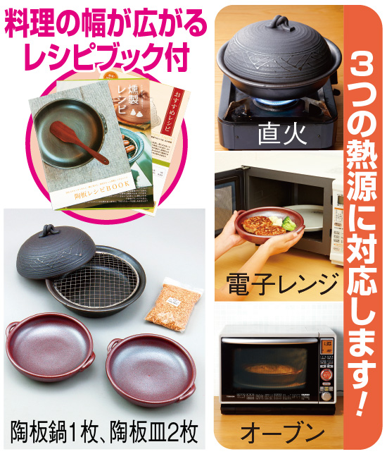 煮る、蒸す、炊く、焼く、炒めるの5つの調理方法ができる萬古焼の陶板鍋と陶板皿のセットのご紹介です。土鍋の生産量日本一を誇る三重県四日市市産で、熱伝導率に優れているのが特長。和洋中の料理もラクラクで、素早く美味しく作れます。しかも耐熱性にも優れ、電子レンジ、直火、オーブンの3つの熱源に対応し、レンジで温めてからオーブンに、直火で熱してからオーブンに、というような負担のかかかる料理にも安心して使えます。また、遠赤外線効果があり、ふっくらと仕上がるのも魅力。さらに、陶板鍋は蓋付きで、付属の金網とスモークチップを使えば燻製も作れます。陶板皿は一人前のグラタンやステーキなどを作る際にも便利です。一家に一つ、ぜひ欲しい万能の鍋・皿セットですので、この機会にぜひおすすめします。