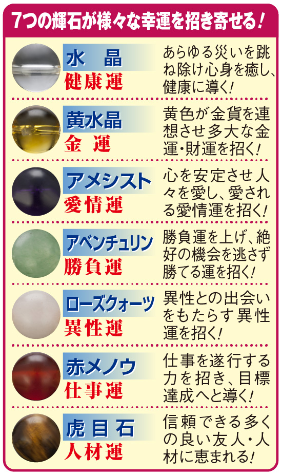 人は生まれた年の干支毎に守護神が存在し、その守護神が入ったものを身につけていると開運・厄除け・諸願成就などのご利益があるといわれています。こちらのブレスレットは、その守護神を刻印した水晶を中央に配し、7種類の輝石を連ねた逸品。守護神が刻印された水晶は、あらゆる災いを跳ね除けながら心身を癒し健康に導くといわれる輝石。金貨を連想させる輝きから金運・財運を招くといわれる黄水晶など、連なる輝石はそれぞれに招福のいわれを持っています。開運・厄除け・諸願成就のお守りとして毎日身に付けるだけで、同時にあらゆる運気の上昇を強力に祈願!ぜひともこのブレスレットを毎日身に付けていただき、様々な幸運を手にしてください。