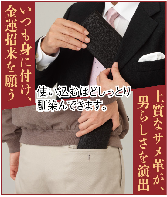 牛革、豚革、馬革、山羊革、クロコダイル革…。財布に使われる数多くの革には、それぞれに特長を持っています。今回、紹介させていただくのは、シャーク革の長財布です。他の革の多くが、陸の動物であるのに対して、シャーク(サメ)は海の生物。そのため、水に強く、高い強度を持っているのが大きな特長です。鮫肌と言われるウロコ部分は加工で処理されているため、ざらざら感はなく、むしろしっとりとした触り心地です。また使いこむほどに、味が出てきます。表側だけではなく、内側もシャーク革を使用しています。折りたたみ財布よりもお金が貯まると言われている長財布。品質が高く、またシンプルなデザインの長い財布は長く愛用できます。