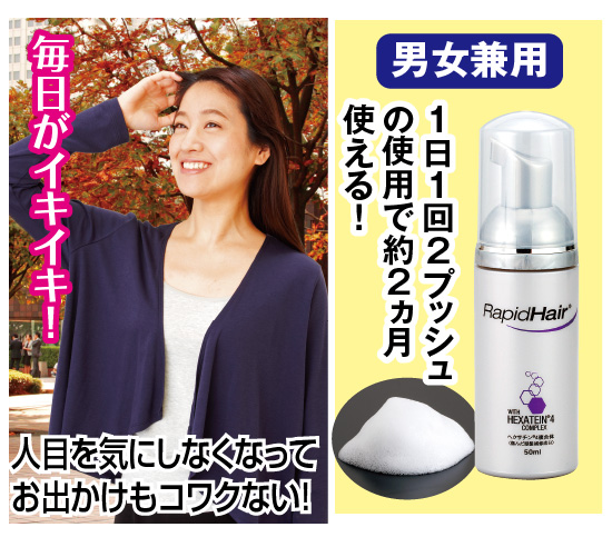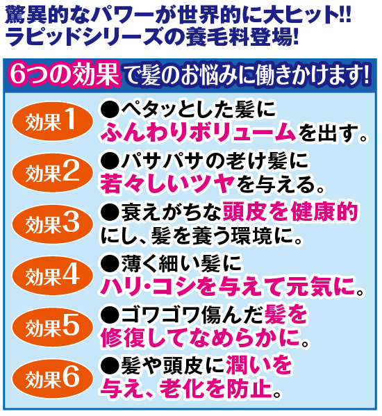 髪がペシャンコ、細く薄くてスケスケに…。寂しい老け顔にする年齢髪のお悩みに、この養毛料をお薦めします。なんと見た目が50%以上変わったと多くの方が実感する凄い実力。それもそのはず、若々しいまつ毛や眉毛へ整えると大ヒットした「ラピッドシリーズ」の待望の養毛料なのです。髪の見た目がしっかり変わる秘密は、頭髪を補修補助し、6つのお悩みに1本で応える独自の成分。中でも分子を小さくしてカプセルに閉じこめた修復剤が頭皮にぐんぐん浸透し、衰えがちな毛に根本から力を与えて活性化し、太く濃くボリュームのある髪へ導きます。さらに頭皮をケアし、ハリ・コシのある健やかな髪に整え、ツヤや潤いも与える成分を贅沢に配合。あなたも『イメージが変わる』と言われるほどの髪の感動を体感してください。