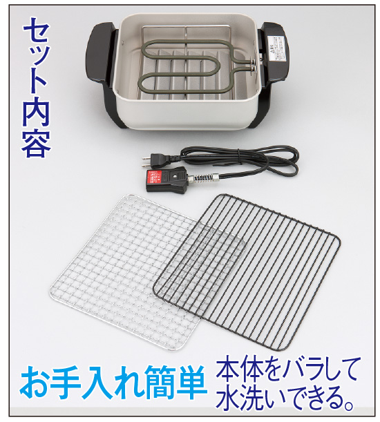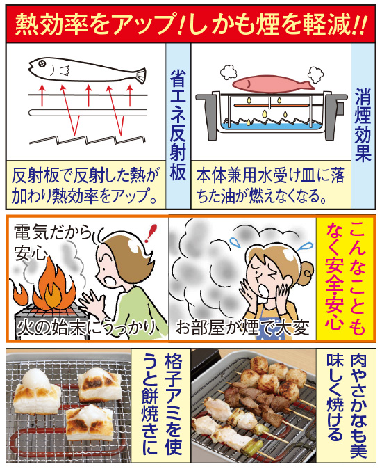 ご家族やお友達など大勢で集まり、ワイワイ、ガヤガヤと楽しいバーベキューや焼肉パーティー。でも部屋の中に煙や臭いがこもったりと大変です。この網焼きグリルなら煙も少なく調理時間も短縮。余分な油を落としてとてもヘルシーな調理が楽しめます。水受け皿の水で落ちた油が冷やされ、燃えないので煙が出にくくなります。卓上で安心して使え、お部屋もスッキリ。電気グリルの省エネ反射板が熱効率をアップして早く焼き上げるだけでなく、まるで炭火焼のように美味しく焼き上げます。直火と違い電気ですので火の消し忘れの心配もありません。本体は簡単に分解して丸洗いでき、お手入れも簡単。しっかりした日本製で末永くお使いいただけます。
