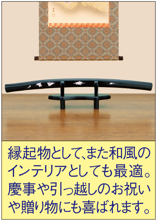御守刀は日本に古くから伝わるもので、お守り(護符)として邪気や災厄を祓うものとして扱われ、護身や健康長寿、守護繁栄の願いをこめて家に飾る風習があります。この御守刀「桜花」は刃物の三大産地の一つ、岐阜県関市で美術刀や居合刀を作り続けている熟練刀剣職人が一つ一つ丹精込めて手作りした優美刀です。漆黒の柄と鞘に日本を象徴するとされる「桜」を蒔絵風にあしらいデザイン性の高いインテリアとして復刻した美術刀の逸品です。桜の花言葉でもある「精神美」や「高貴」にふさわしい名品としてご愛蔵いただき、貴家の守護と繁栄をご祈願ください。また、大切な方へのお祝いや贈り物にも最適です。
