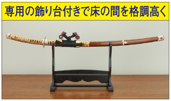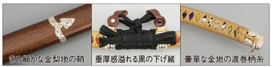平安時代の天才刀工「三条宗近」によって作られた太刀で、天下五剣の中でも最も美しいとされる名刀「三日月宗近」。その美しさゆえに足利家、豊臣家、徳川家と受け継がれました。豊臣秀吉の正室、高台院が所持し、後に遺品として徳川秀忠に贈られ、以来徳川将軍の所蔵となりました。刀身は細身で反りが大きく、鍔元の幅が広くて切先の幅が狭い、とても優美な太刀です。金梨地の鞘に金地の柄糸、下げ緒に黒の綿糸を使用し、鞘の上部を柄糸と同じ色で渡巻きにしたもので、その外観から糸巻太刀拵と呼ばれております。本商品はそれを元に三日月宗近を忠実に再現した見栄え美しい陣太刀です。国宝指定名称は「太刀銘三条附絲巻き太刀拵鞘」となっております。ぜひお手に取りご確認下さい。