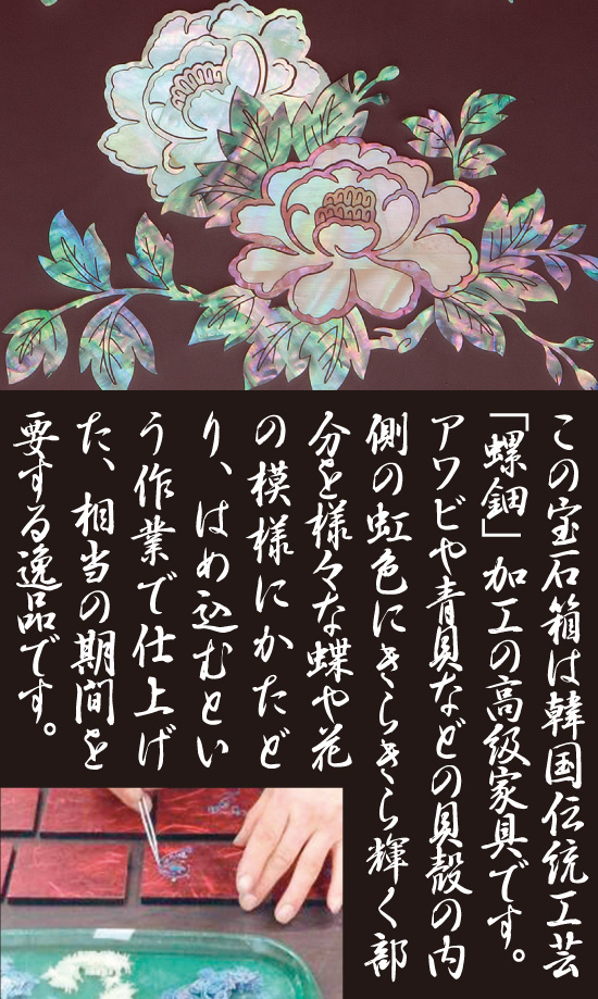 韓国の伝統工芸「螺鈿」。あこや貝、青貝を木地に丹念に手作業ではめ込む技法で、煌びやかな鳥や花柄を配した高級ジュエリーボックスです。宝石、時計などの貴金属、大切な思い出の品々を集めて保管するのに最適の螺鈿細工宝石箱は、豪華で煌びやかなインテリア置物として美しく存在感があります。ミラー付の蓋はネックレスなどの装着感を確認するのにぴったり。上段は4分割、下段2段引出しは布張りで大切な貴重品を傷つけること無く収納出来ます。