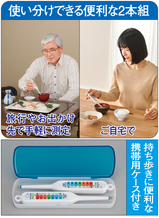 塩分は人の身体には必要不可欠な成分ですが、摂り過ぎると血圧を上げる、肝臓や血管に良くないとされています。厚生労働省は一日の塩分摂取目標値を成人8g以下、生活習慣病(高血圧や糖尿病など)の人は6g以下と定めています。でも塩分を控えたいけど、実際に摂っている塩分量がわからなくて…そんな方におすすめの塩分計です。食べる前の味噌汁やスープに差し込むだけで塩分濃度を0.3%~1.5%まで手軽に測れます。例えば200ccの汁物の塩分を測定して1.5%と表示されれば、200cc×1.5%=3.0gの塩分を摂取することになります。スイッチを押すとLEDライトが点灯し塩分濃度を知らせてくれるのでとても分かりやすく、年配の方にもぴったり。2本セットなので一本は家庭用に、旅行・外出時と使い分けにも便利です。