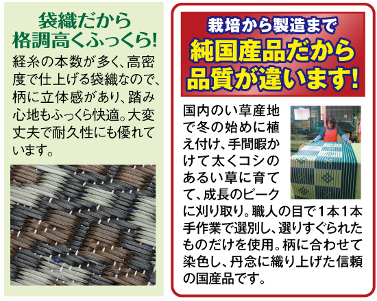 まるで手織の絨毯みたい!そんな感動の声が上がるい草ラグです。栽培から織り、仕上げまで全て国産にこだわった安心の日本製品です。い草の本数を多く使い、伝統技を受け継ぐ職人が手間暇かけて織り上げた袋織だから、柄の立体感や繊細さが違います。畳にもフローリングにも高級感溢れる表情で調和し、お部屋を格調高く演出してくれます。い草が密なのでふっくらとした踏み心地が快適。耐久性に優れた長く使える逸品です。さらにサラッとした触り心地のい草だから、ゴロンと寝転んでも汗でベタつくことなく、ひんやり快適!爽やかな香りが清涼感を一層高め、冷房嫌いの方にも最適です。正方形と長方形、それぞれグレー系とブルー系の2色をご用意しました。この機会にぜひ、心地よい夏のお部屋づくりにお役立てください。