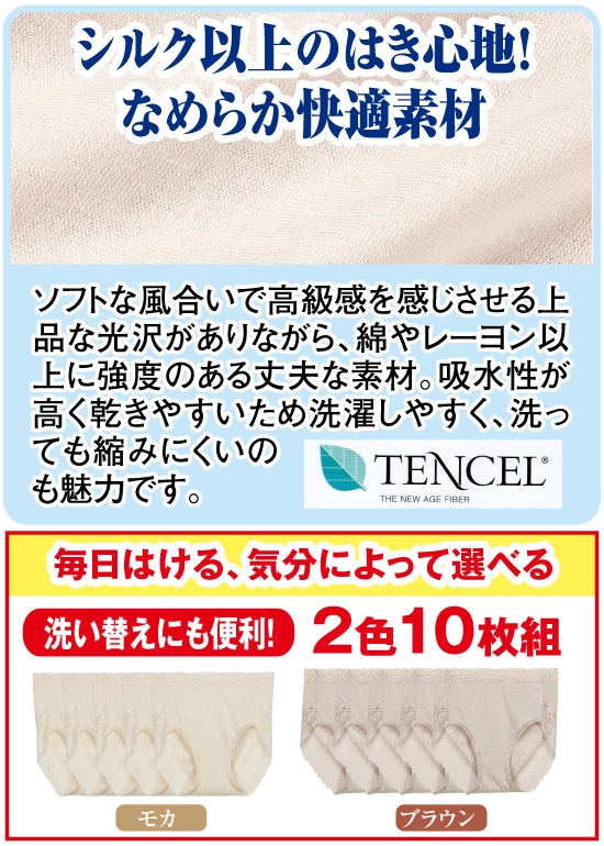 女性の素肌に直接触れるショーツに使用するのにこの上ない質感を追求したテンセル混生地でつくった深ばき型ショーツの10枚組です。微妙な部分だけにテンセル特有のなめらかな肌ざわりがしっくりとなじみます。安心感のある深ばき型で、腰まわりと脚口には高級感のある幅広のストレッチレースを配し、ソフトな着用感が得られるのと同時に食い込まず、ずり上がりを防ぎそしてヒップアップにもひと役かいます。ゴージャスなショーツを一気に10枚のセットでお届けします。素肌になめらかな着用感を一年中お楽しみください。
