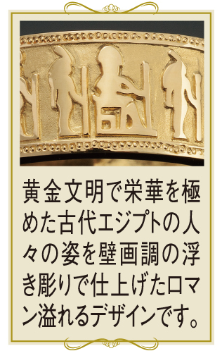 かつて黄金文明で栄華を極めた古代エジプト文明。今も遺跡に鮮やかに残る、その壁画を18金にレリーフで再現したリングです。まばゆい山吹き色の輝きが際立ち、漂う時空を超えた悠久のロマン。確かな存在感を見せ、豪華にエレガントにあなたの指を飾ります。普段使いからフォーマルまで、幅広くお使いください。