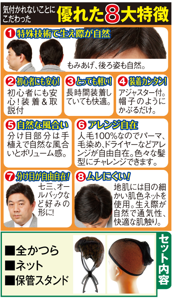 薄毛に悩む多くの男性諸氏に大声でご紹介したいかつらの逸品のご紹介です。ご用意したのは、100%人毛の人工地肌付きかつらで、分け目部分は丹念な手植えが施され、自然な風合いとボリューム感は見た目も付け心地もまったく違和感がありません。しかも軽量で裏地メッシュなので、長時間使っても快適です。内側はサイズ調節が簡単なアジャスター付きで、どんなサイズにもジャストフィット。装着は極めて簡単で、初心者の方もスグにお使いいただけます。お手入れも簡単で、市販のシャンプーで洗うだけ。人毛100%なのでパーマや毛染め、ドライヤーでのブローなど、憧れのヘアースタイルもラクラクです。今回は、衛生的で型崩れを防ぐ保管スタンド付きで大変便利。人毛100%でありながら10万円台を切るお得な価格も見逃せません。思い切ってお使いなる絶好のチャンスですので、ぜひお買い求めください。