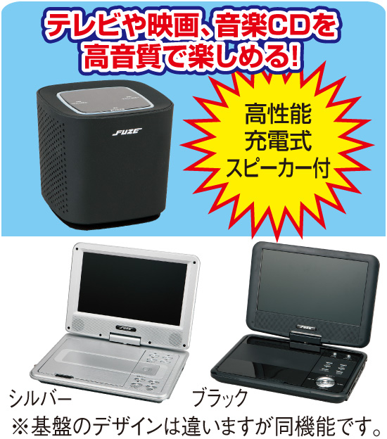 寝室や書斎など自分だけで思い切りテレビ番組や映画、音楽を楽しみたい…。そんな願いを叶えてくれるDVDプレーヤーとスピーカーのセットです。高画質フルセグ地デジ放送をはじめ、DVD・CDソフトで映画や音楽の鑑賞も思いのまま。高音質のスピーカーを接続して臨場感あふれるサウンドと共にお楽しみいただけます。軽量コンパクトなので家中どこへでも持ち運びがラク。画面は9インチで、ベッドで横になったままでも見やすいよう角度調節ができます。DVDプレーヤーはカー電源・内蔵バッテリー対応、スピーカーは充電式なので、車の中や屋外でも大活躍。またスピーカーはお持ちのテレビなどに接続することもできます。ブラックとシルバーはデザインは違いますが機能は同じです。お好きな方をお選びください。