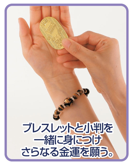 毎日身につけることで、さらなる金運・開運を願った四神獣金運石ブレスレットと金沢金箔小判のセットです。ブレスレットには風水で最高の吉相と言われる東西南北の守護神朱雀、青龍、玄武、白虎の四神獣を刻印した魔除けの石といわれるオニキスと、邪気を払い金財運を向上させるという虎目石、大願成就の白水晶を配しました。あなたをしっかり守護し、開運石のパワーを力強く後押しします。金色と漆黒に輝く格調高い仕上がりはアクセサリーとしてもお洒落です。また伝統工芸品として知られる金沢の金箔で作られた小判は、財布に忍ばせておくとお金がどんどん貯まるとされる縁起物。宝くじの高額当選など金財運上昇を願い肌身離さずお持ちになれば更なる金運を招いてくれることでしょう。