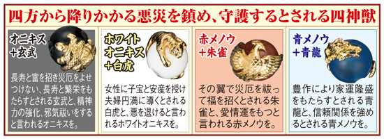 あなたに潜在する運気上昇の力を、風水と貴石の力で呼び覚ます四神獣虎目石ブレスレットです。四神獣とは中国の漢時代の神獣で、玄武、白虎、朱雀、青龍、が四方から降りかかる悪災を鎮めて守護したと言われています。今回ご紹介の商品は、その四神の型を起こしそれぞれの色石にあしらった、大変豪華な仕上がりの心強いブレスレットです。しかも、貴石それぞれもパワーを秘め、オニキスとホワイトオニキスは邪気を祓い、赤メノウは心身の健康を願い、青メノウは人との信頼関係を強める石と言われています。金運、仕事運などを高めるとされる貴石タイガーアイ、集中力を高めるとされる水晶も加え、この上ない開運上昇のパワーを秘めたブレスレットに仕上げてあります。毎日、肌身離さず大切に身につけてください。あなたのさらなる運気上昇の扉が大きく開くことでしょう。