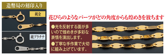 貴金属として価値の高い純プラチナと純金を惜しげもなく使用した、一生ものにふさわしいゴージャスなネックレスです。花びらのようなパーツが連なり、一つ一つがキラキラと光を放つ繊細な表情のペタルチェーン。胸元にかけて二連、三連とボリュームを増し、動くたびに華やかな輝きがあふれ、まばゆいほどあなたを魅力的に見せてくれます。純プラチナ、純金ともに造幣局検定マーク刻印入りで、永遠の財産としてお持ちいただける確かな品質。忙しい毎日を頑張ってきたご自分へのご褒美として、ぜひあなたも本物の贅沢を味わってください。