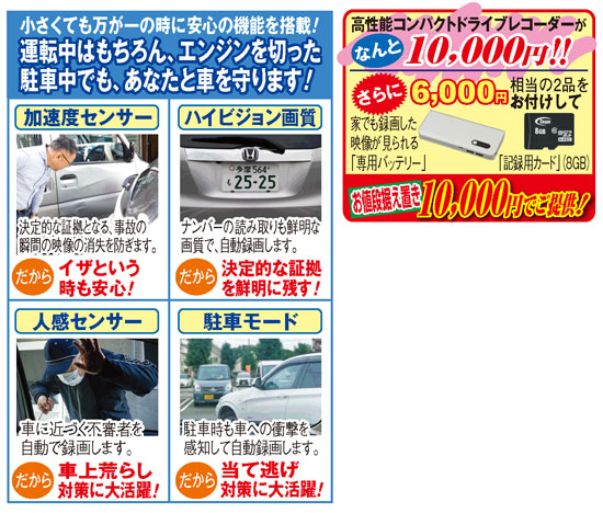 気を付けていても、いつ巻き込まれるかわからない車の事故。事故の瞬間の映像を記録し、事故後の処理に役立つドライブレコーダーは今や車の必需品。そんなドライブレコーダーにコンパクトタイプが新登場。その大きさは運転中の視界を妨げないわずか7㎝! こんなに小さくても運転中の映像はハイビジョン画質で自動録画。事故の瞬間をしっかり記録します! 一般的なドライブレコーダーは上書きされ事故の映像は消えてしまいますが、小さくても高性能なこのドライブレコーダーは上書き消失を防ぐ「加速度センサー」付き! 映像をしっかり残します。また衝撃を感知し自動で録画する「駐車モード」を搭載、駐車場での当て逃げ対策に大活躍!」車に近づく不審者を自動で録画する「人感センサー」で車上荒らし対策も万全です。取り付けも吸盤で付けるだけで、機械が苦手な女性でも困ることはありません! しかも今回は届いてすぐ使える「記録用カード」と録画した映像を家でも見られる「専用バッテリー」の、合わせて6,000円相当のお品を特別にお付けして何と1万円! ぜひお得なこの機会にお求めください。