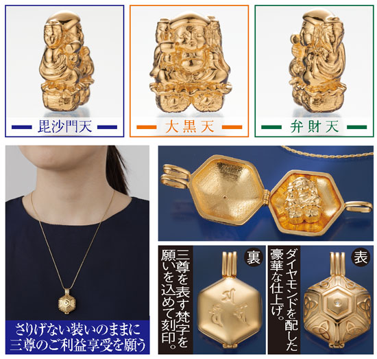 足軽を天下人に変えた豊臣秀吉の守り本尊とされる三面出世大黒点は、大黒天、毘沙門天、弁財天が三位一体となった尊像であり、その力で金銀財宝を招き、才能を開花させ、勝負運を授けると言われています。そしてその結果、信奉するものに大金運、大出世、強力縁結びの三つのご利益を授けるとされる大開運神となります。その三面大黒天がペンダントになってあなたの胸に豪華に輝きます。ペンダントは亀甲型のロケットになっており、大黒天、毘沙門天、弁財天を表す梵字を裏面に配し、表面中央にダイヤモンドを配した上品で高級感溢れるデザインです。見た目は普通の和風ペンダントですが、その中に三面大黒天が納められていますので、さり気ない装いのままにいつも身につけ、三神の絶大なご利益をご祈念ください。