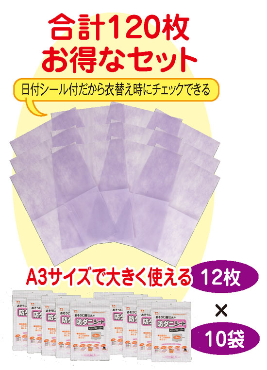 掃除のプロも使用している優れモノが、この「おそうじ屋さんの防ダニシート」です。その効果は検査機関により6週間で約70%の増殖抑制率が確認されているので安心して、ご使用できます。ふとんの隙間やカーペットの下に敷いておくだけで、シートに練り込まれた有効成分がダニの増殖をしっかりと食い止めます。しかも、殺虫成分を含まないので、肌が触れる場所に使っても安心・安全。効果は6ヶ月と長持ちで、衣替えの時期まで使えて重宝です。サッと取り出してすぐに使えるA3サイズ広幅の防ダニシートです。燃えるゴミと一緒に捨てるだけで処分も実に簡単です。銀イオンも練り込まれ抗菌・防臭効果も発揮。今回は、なんと12枚入りを10袋、計120枚セットで提供いたします。
