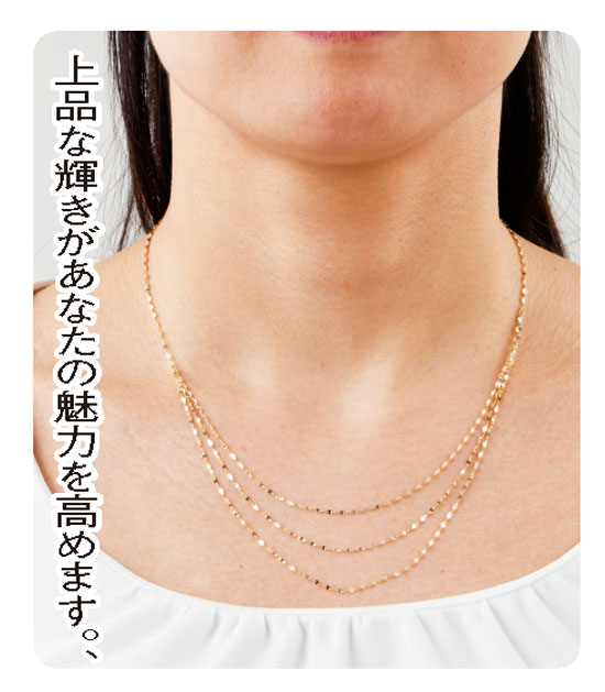いつの時代にもその輝きを失うことなく、価値ある貴金属として人気の高い18金を贅沢に使った有名ブランドの3連ネックレスです。繊細なデザインを得意とする、イタリアはビエリ社製のエクレアチェーンに段差をつけた3連ネックレスで、18金から放たれるキラキラとして上品な輝きは、周囲の視線を独り占めしそうです。しかも、ゴージャスでボリューム感もあり、あなたの胸元を誇らしくエレガントに彩ります。洗練されたデザインもおすすめで、普段のお出かけからパーティーなどの晴れの席まで幅広くお使いいただけます。3cmの間で長さ調節ができるので、着こなしに合わせやすいのも魅力。今回は、メーカーの協力により、大変お求めやすい価格を実現していますので、見逃せません!