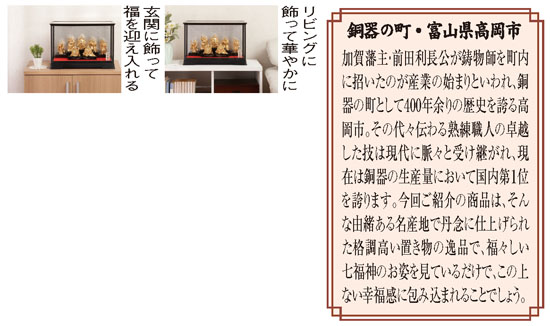 古くから「七難即滅、七福即生」と伝えられるように、七福神を神捧すると災いが除かれ、あらゆる幸福を授かると言われています。さらに、不老長寿、商売繁盛、五穀豊穣、家内安全などの諸願成就のご利益があるとも言われるありがたい神様です。今回ご紹介の商品は、そんな七福神の大黒天、恵比寿、布袋尊、寿老人、福禄寿、弁財天、毘沙門天のお姿を、銅器の町として400年もの歴史を誇る富山県高岡市の匠の技で仕上げた大吉祥な置き物です。高岡で作られる仏像などは、鋳造、仕上げ、着色まで、その道一筋の熟練職人によって丹精込めて作られ、鋳肌や色合いに高級感があり大変人気があります。細部まで精緻に作られた金色の七福神は、眺めているだけで福々しい気分。付属の格調高いガラスケースにお飾りになれば、福運到来の期待も一層高まります。どうぞリビングや玄関、床の間などにお飾りになり、毎日、ご家族のさらなる隆盛と繁栄をご祈願ください。