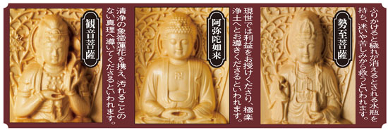 阿弥陀如来は極楽浄土の主尊であり、遍く一切を照らす光明は生命のあるものすべてに現世利益をお授けくださり、浄土へと導いてくださるといわれています。この「懐中仏 阿弥陀枕三尊」は、そんな阿弥陀如来のお姿を、銘木と謳われる錦木の厨子の中央に精緻な彫りで納めたありがたい逸品です。扉を開けば、右に清浄の象徴である蓮火を持つ観音菩薩、左に功徳水で満たされた水瓶を携えた勢至菩薩の威厳に満ちたお姿が現れます。三尊のやさしい表情やお手の持物、そして光背に至るまで施された精緻な彫りは、まるで芸術品のような美しさ。素材の錦木は木目が美しいことで知られ、大願成就をもたらす大変縁起の良い木ともいわています。日々の守護仏として肌身離さず持ち歩くのはもちろん、お部屋などにお祀りいただき、極楽往生を願うとともに、大いなるご利益のご享受をご祈願ください。