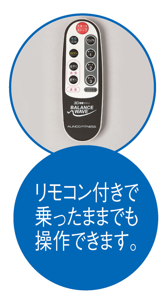 最近よくつまづく、ちょっとした階段や歩行が辛いなど、日増しに体力の衰えを感じる…。そんな方に無理なく始められる今話題のトレーニングマシーンです。ブルブルブルブルと上下・左右に振動する進化した3Dタイプの立体運動マシーンで、上にただ乗るだけで身体を鍛えられるから驚き! バランス運動や有酸素運動、筋力トレーニングの3つの運動が行え、ご年配の方でも身体に負担をかけず安心して使えます。また、3種類の振動プログラムを内蔵し、16段階から振動速度が選べ、しかもタイマー付きなので自分の体力に合わせて無理なく使えるのも魅力。立ってする体幹トレーニングや座ってする骨盤運動など、多彩なエクササイズができて重宝します。しかも付属のエクササイズバンドを使えば腕のトレーニングもOK。リモコン付きなので乗ったままでも操作が可能です。近頃、身体が衰えたとお嘆きの中高年の方の健康増進に、ぜひおすすめします。
