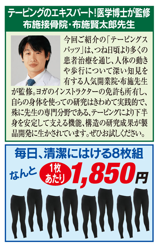 スポーツ医学におけるテーピング倫理に精通した、医学博士が太鼓判を押す、はくだけで足腰の動きがらくになる「テーピングスパッツ」です。疲れの溜まる下半身にテーピングを施すように、単に着圧の強さを変えるだけでなく、ヒップや下腹、膝周りなど部位別に編み方を変え、よりきめ細かに動きの中での着圧の強弱を設定。関節の動きを制限することなく、テーピングと同じように筋力をしっかりとサポートします。器具を買い揃えたりスポーツジムに通ったりする費用も時間も、もう必要ありません。毎日コレをはいて普通に過ごすだけで、あこがれのスッキリ下半身が貴女のものに。薄手で動きやすく、外装にひびく心配もありません。汗ばむ季節のシェイプアップにうれしい8枚組でのお届けで、1枚あたり1,850円というお求めやすさも大きな魅力です。